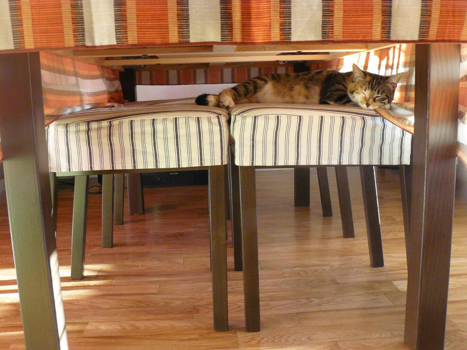 *Note: Caline and Frère have often enjoyed taking naps under the table but mostly Caline. To see them under the table when they were smaller click here.